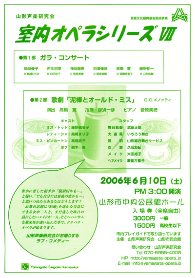 | 第 2 部 | ≪歌劇「泥棒とオールド・ミス」( G. C. メノッティ)≫ 演出:高橋 寛、指揮:那須 一彦、ピアノ:菅原美穂 キャスト:藤野 恵美子(ミス・タッド)、高橋 まり子(レティーシャ)、高橋 直子(ミス・ピンカートン)、鈴木 集(ボブ) スタッフ:武田 正氣(舞台監督)、いちろう舞台(大道具)、山形綜合舞台サービス(照明)、久我 友紀(衣裳)、米田 裕子(メイク)、瀬賀 万喜子(ヘアメイク) |