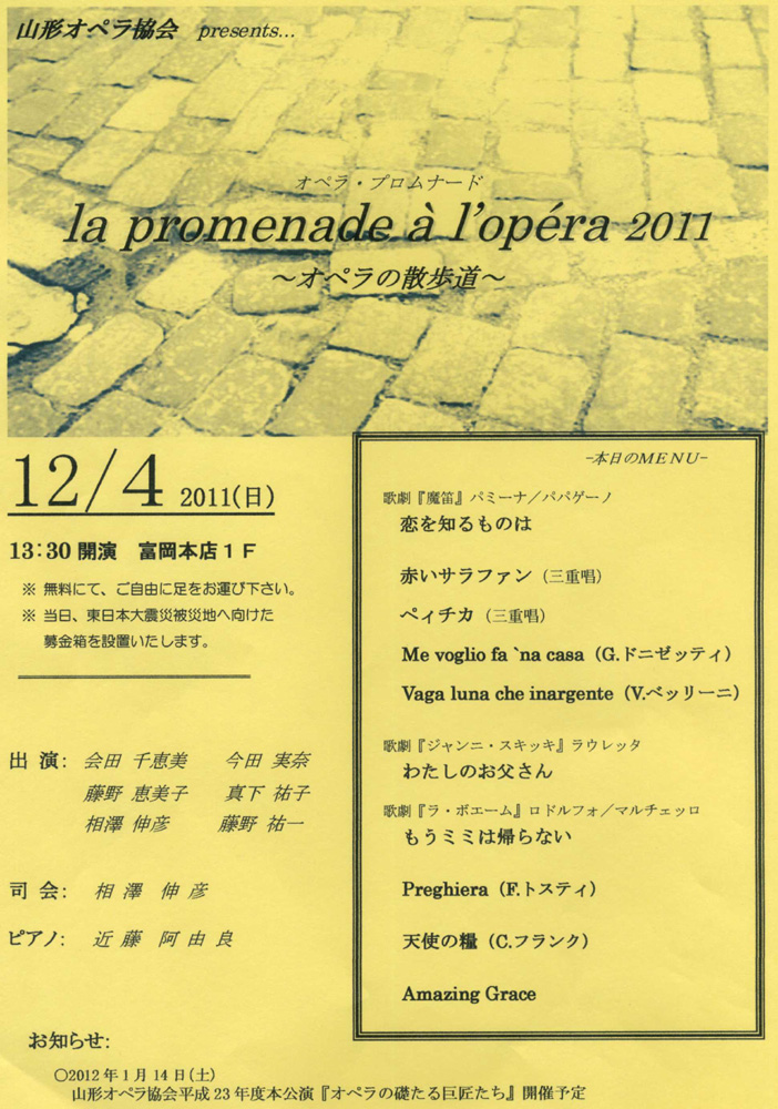 | 出演 | 会田 千恵美/今田 実奈/藤野 恵美子/真下 祐子/相澤 伸彦/藤野 祐一 【司会】相澤 伸彦 【ピアノ】近藤 阿由良 |