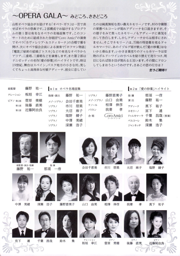 | お問合せ | 山形オペラ協会事務局 携帯:090-2602-3424 山形大学藤野研究室 電話:023-628-4330 |