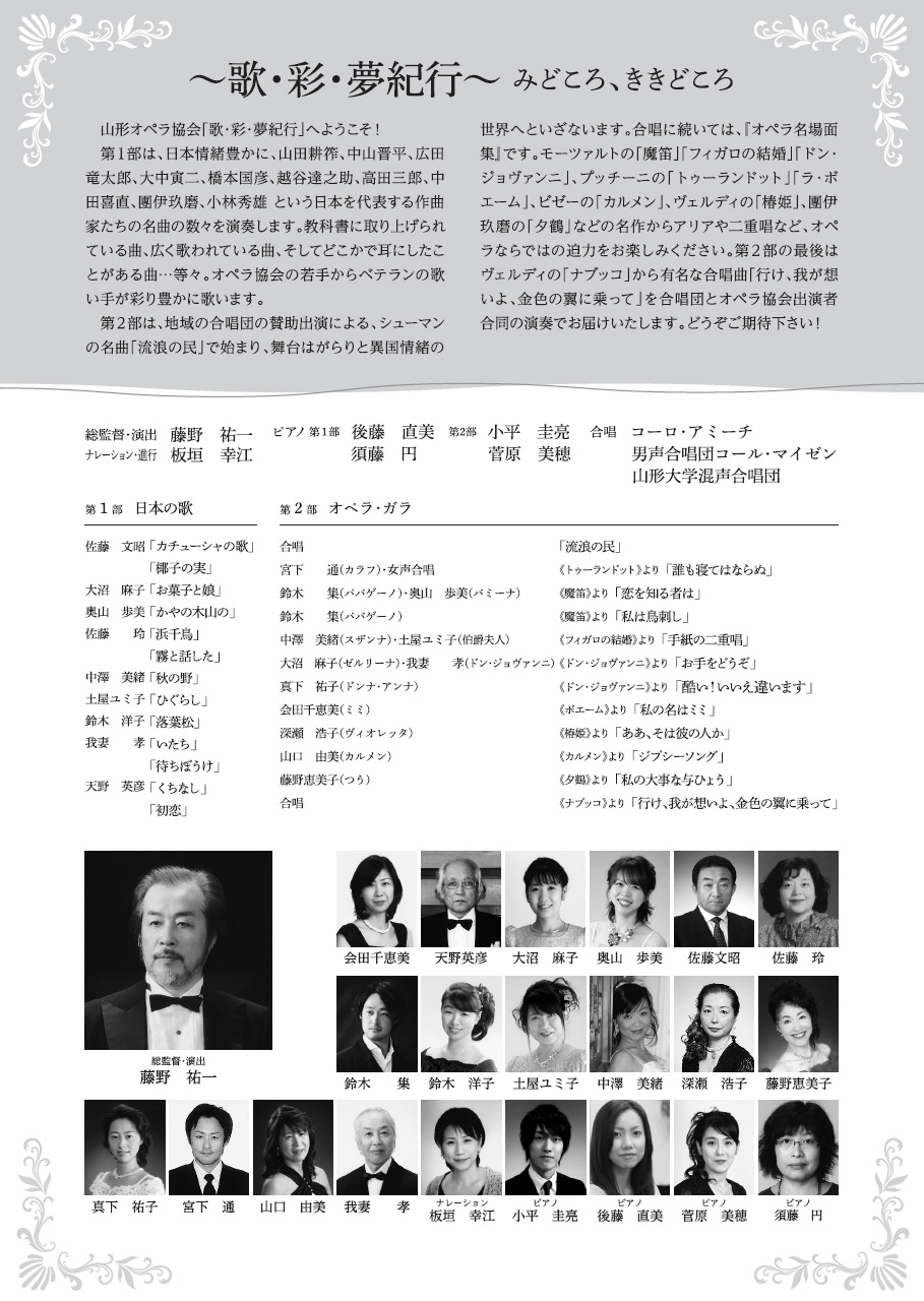 | 演出・キャスト他 | 【総監督・演出】 藤野 祐一 【ナレーション】 板垣 幸江 【舞台監督】 武田 正氣 【ピアノ】 小平 圭亮、後藤 直美、菅原 美穂、須藤 円 【キャスト】 山形オペラ協会 |
