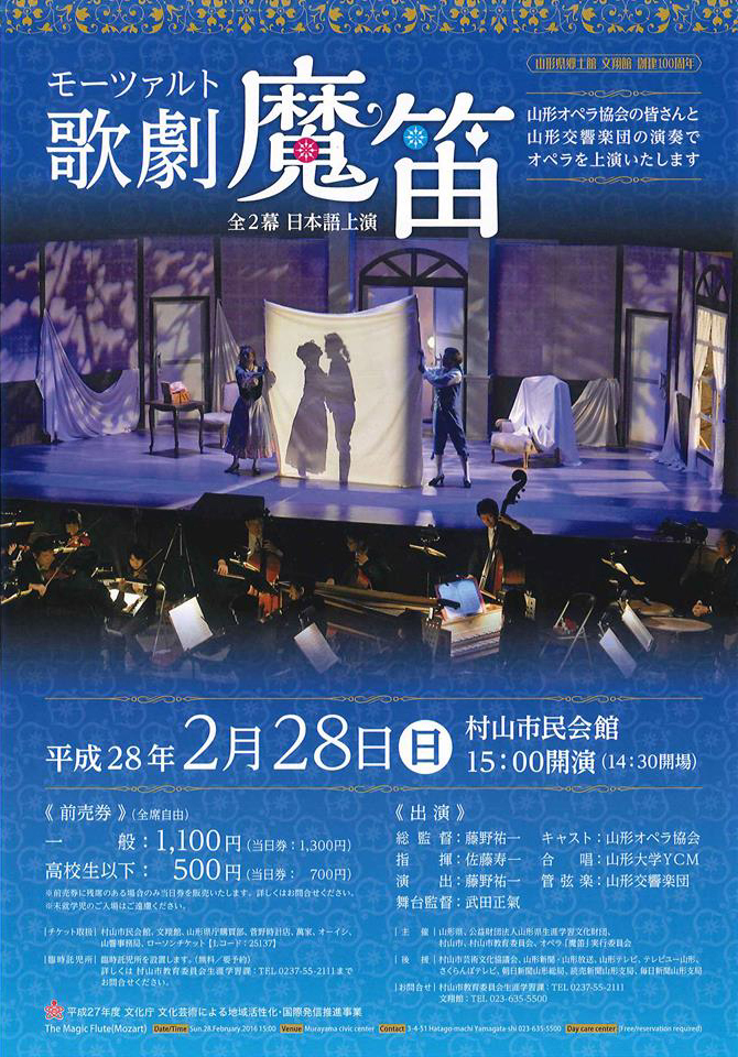 | 主催 | 山形県、公益財団法人山形県生涯学習文化財団、村山市、村山市教育委員会、オペラ「魔笛」実行委員会 |
