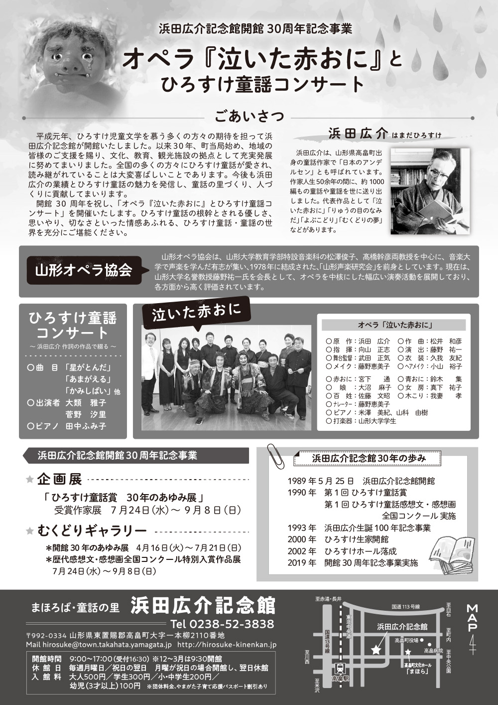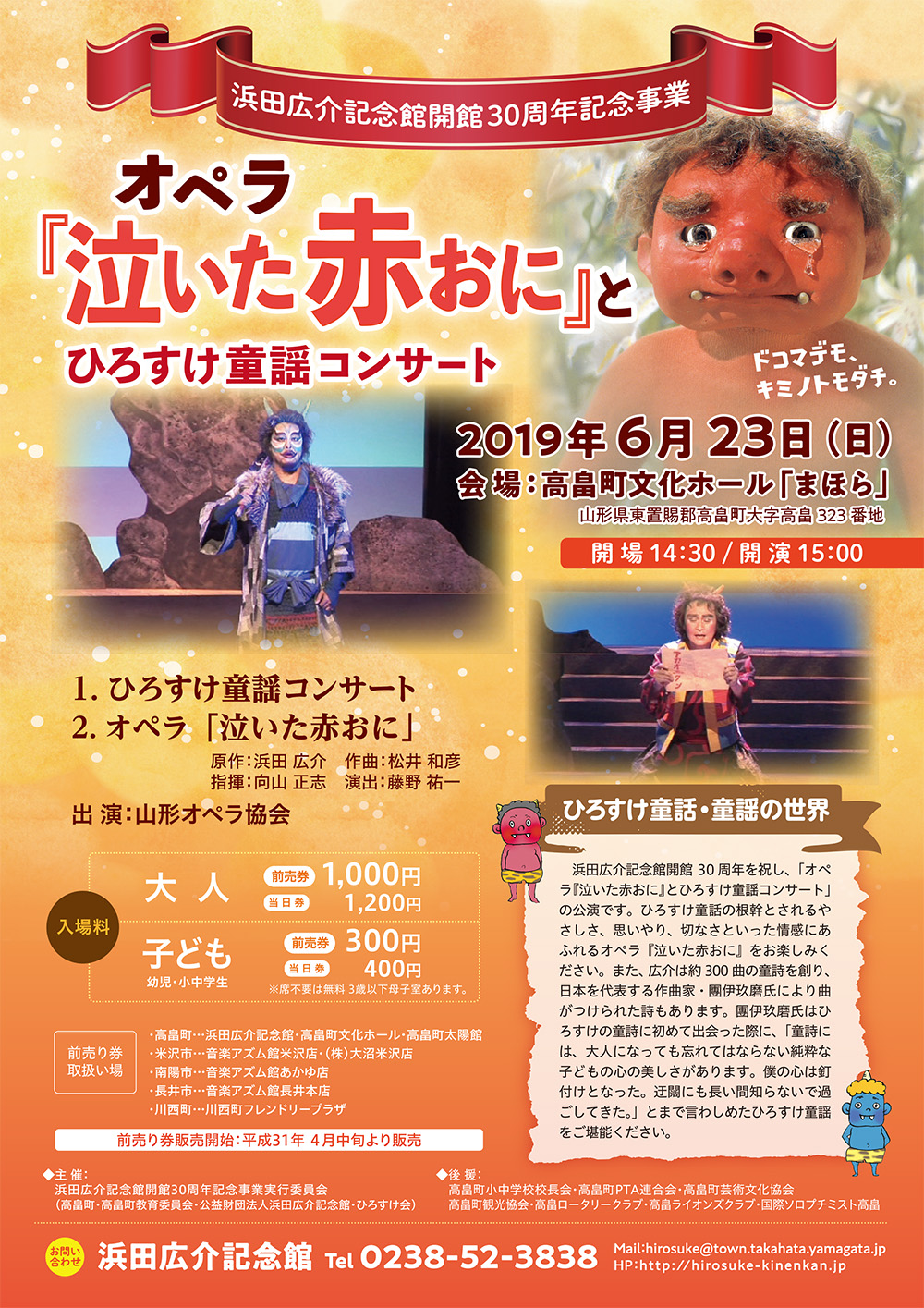 【第1部】ひろすけ童謡コンサート 【第2部】オペラ「泣いた赤おに」 原作:浜田 広介 作曲:松井 和彦 指揮:向山 正志 演出:藤野 祐一 出演:山形オペラ協会 |