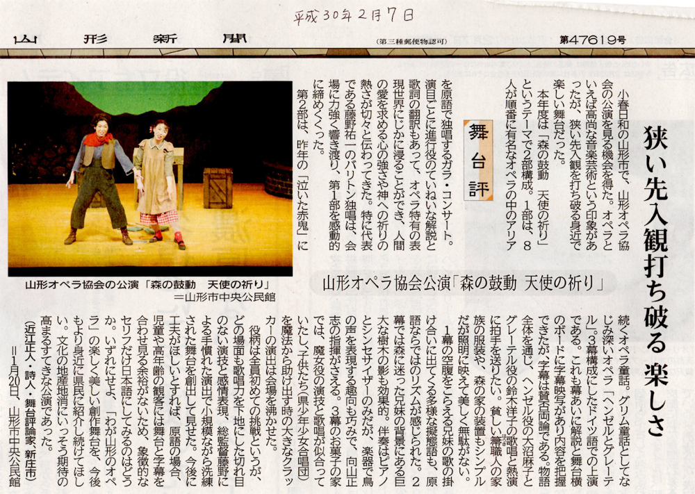 平成29年度本公演「森の鼓動 天使の祈り」の舞台評が山形新聞に掲載されました。(2018年2月7日)※画像をクリックすると拡大した記事が読めます(JPG画像)