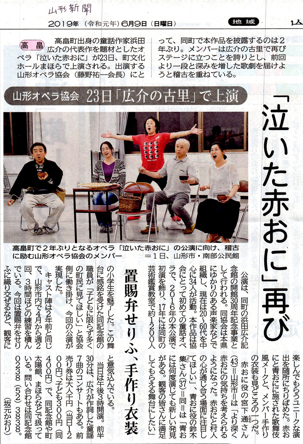 オペラ「泣いた赤おに」が山形新聞社の取材を受けました。(2019年6月9日)※画像をクリックすると拡大画像で記事が読めます