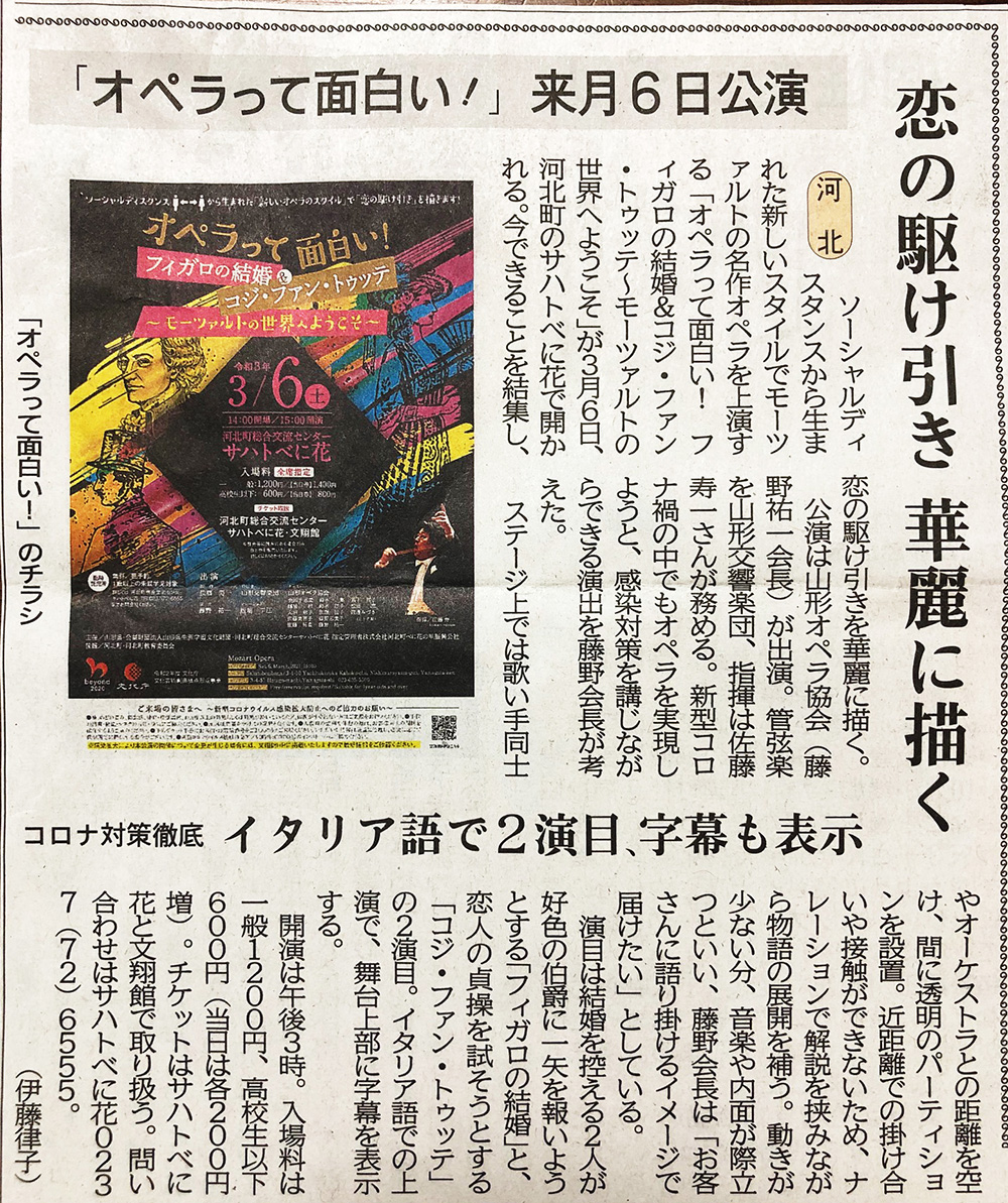 3月6日公演予定の「オペラて面白い!フィガロの結婚&コジ・ファン・トゥッテ〜モーツァルトの世界へようこそ」が山形新聞に掲載されました。(2021年2月28日)※画像をクリックすると拡大画像で記事が読めます