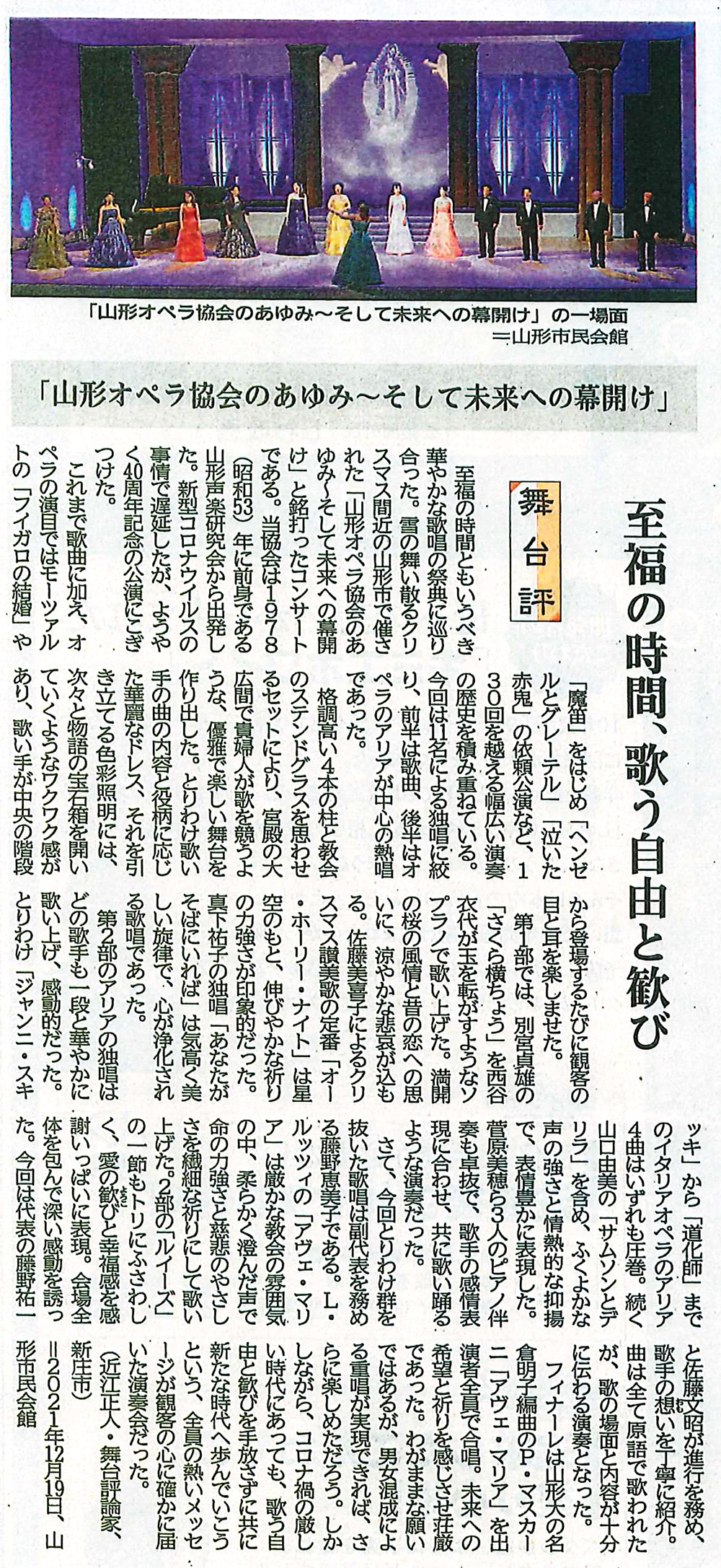 令和3年12月19日に行われた本公演(山形オペラ協会40周年記念公演)が山形新聞に掲載されました。(2022年1月13日)※画像をクリックすると拡大画像で記事が読めます