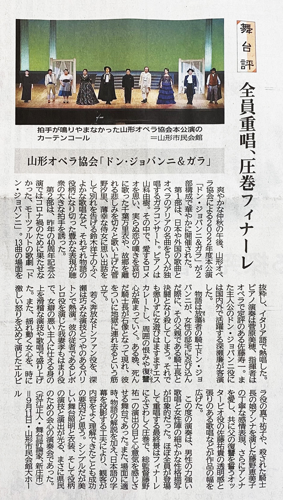 令和4年9月11日に行われた本公演の舞台評が山形新聞に掲載されました。(2022年10月3日付)※画像をクリックすると拡大画像で記事全文が読めます