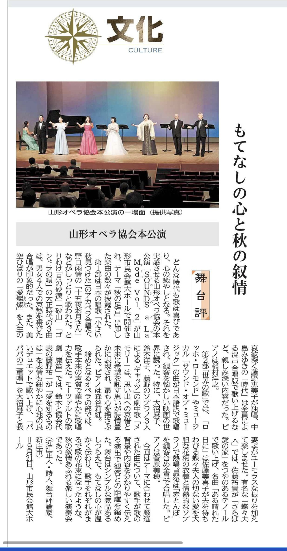 令和7年9月21日に行われた本公演の舞台評が山形新聞に掲載されました。(2025年10月10日付)※画像をクリックすると拡大画像で記事全文が読めます